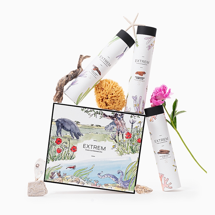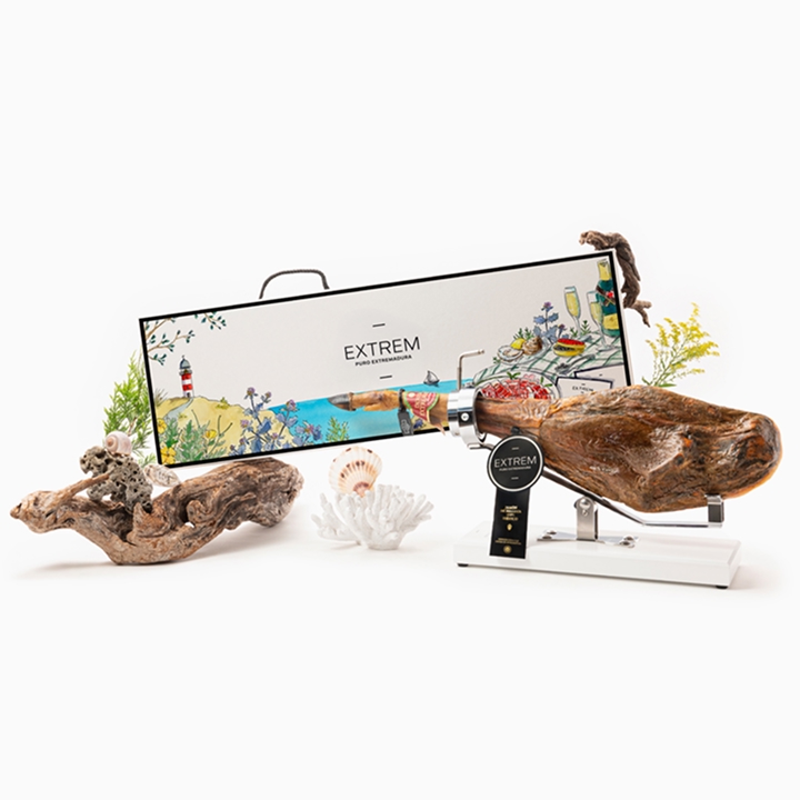 Cierras los ojos y sientes la brisa marina mientras un par de cormoranes sobrevuelan el horizonte: disfrutas del exclusivo jamón de bellota 100% ibérico DOP, donde lo mejor del mar y la montaña se funde en un maridaje extremo que despierta tus sentidos; la ilustración te transporta a la orilla para imaginar el picnic perfecto, acompañado de vieiras y las propuestas “Mar y Montaña Ibérica” del chef Toño Pérez, con el jamón como protagonista…